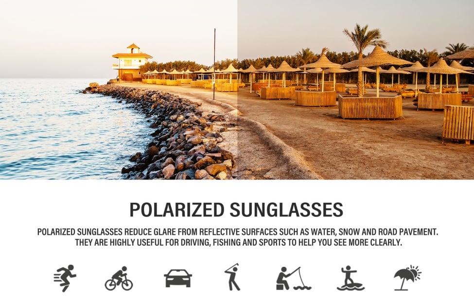 Anti-reflective dark lenses are specially added with polarized coating and provide UV400 protection, reduce glare reflected from roads, bodies of water, snow and other horizontal surfaces, relieve the discomfort of bright light on eyes.