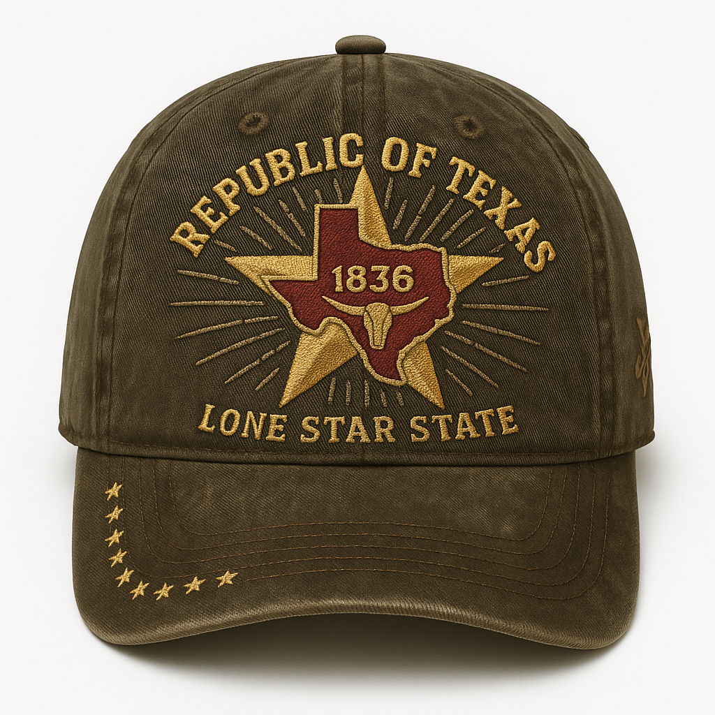 Step into history with the Lone Star Legacy cap, celebrating the proud heritage of the Republic of Texas since 1836 📜. Featuring a bold Texas map over a radiant star 🌟, accented by high-density gold and red embroidery 🎯, it embodies independence, grit, and cowboy spirit 🐎. The distressed army green cotton fabric adds a rugged, vintage touch that’s perfect for daily wear or outdoor adventures 🏞️.